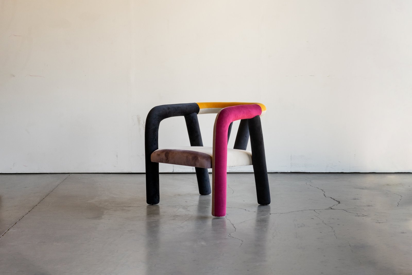 A custom, one of a kind version of the Temi Lounge Chair with jagged, multi-colored patching. We layered yellow, purple, and magenta as accents onto the contrasting blacks and whites. The classic Temi Lounge cushioning and structure remains unchanged, but with a more vibrant overcoat that yields a sharper focal point.