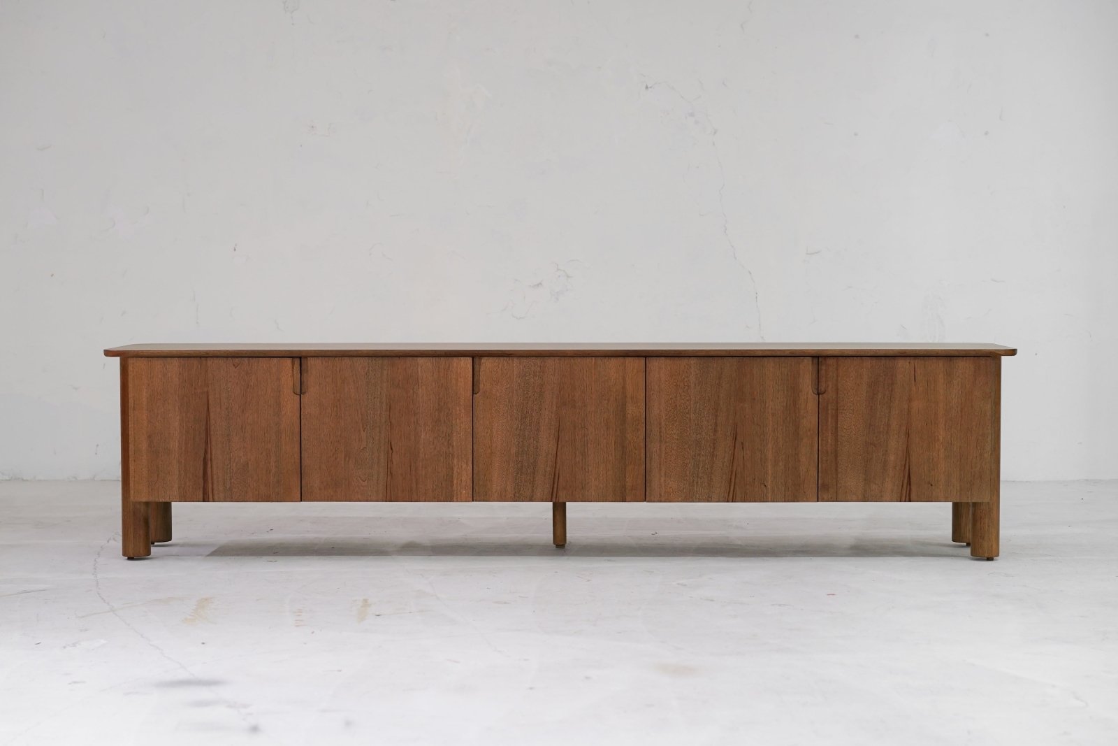 Limited release Arc 96" Media Cabinet, handcrafted using solid makata wood with walnut shelving and back panels. Each plank of makata wood was hand selected for the beautiful heartwood grain running up the center of each door panel. Only one available.
